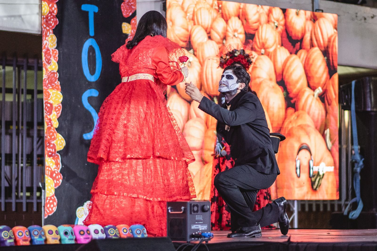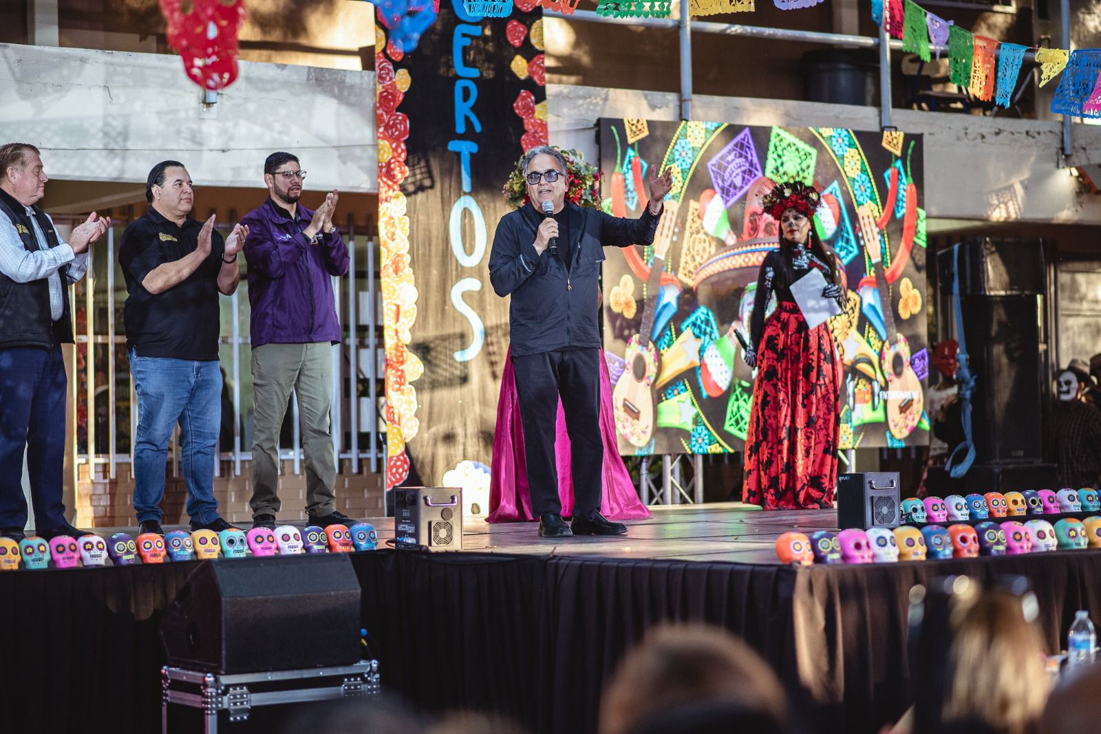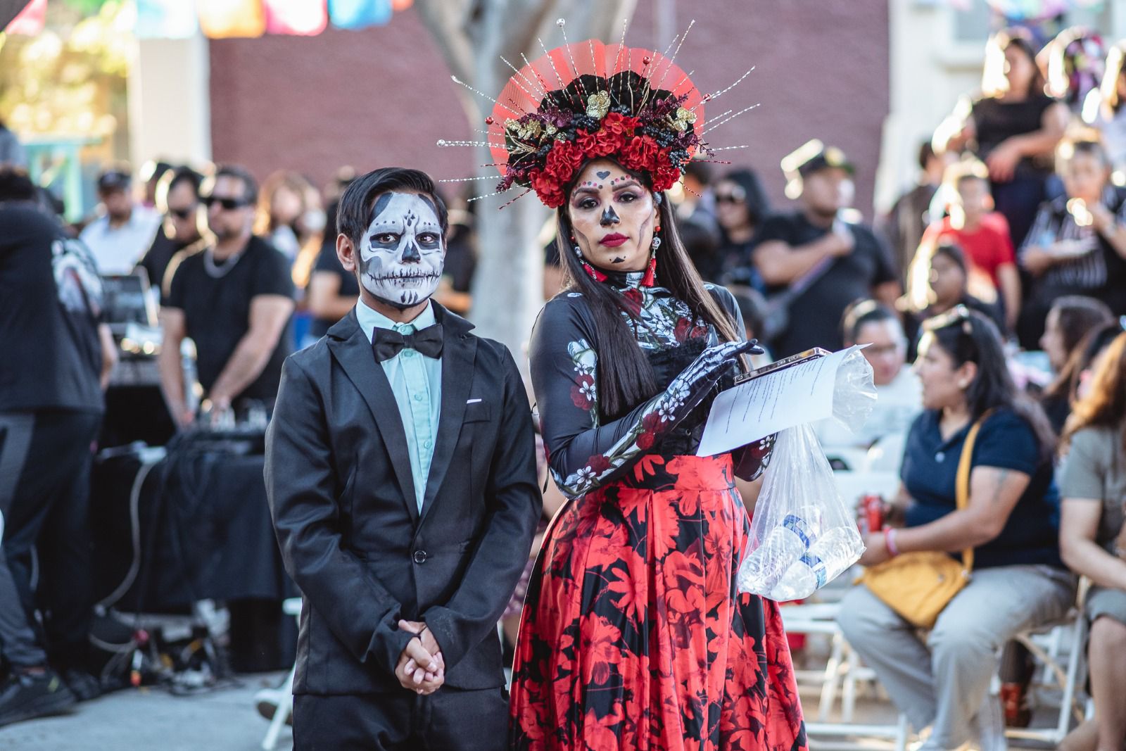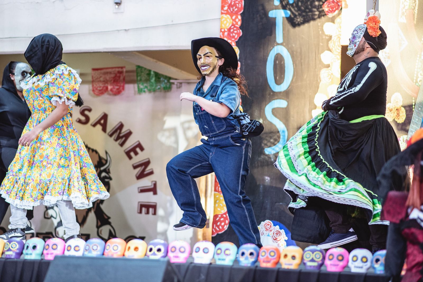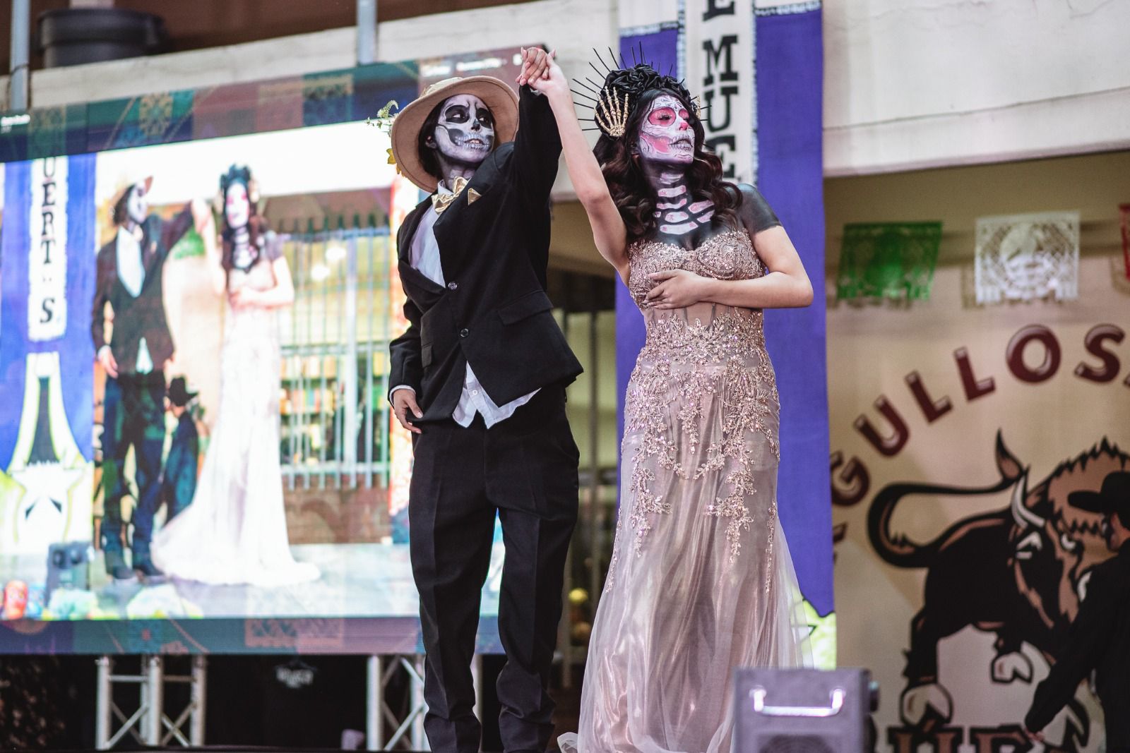 El programa artístico incluyó danza folclórica, canto, representación teatral y como presentación estelar, la pasarela de catrines y catrinas, con la participación de 37 parejas.
